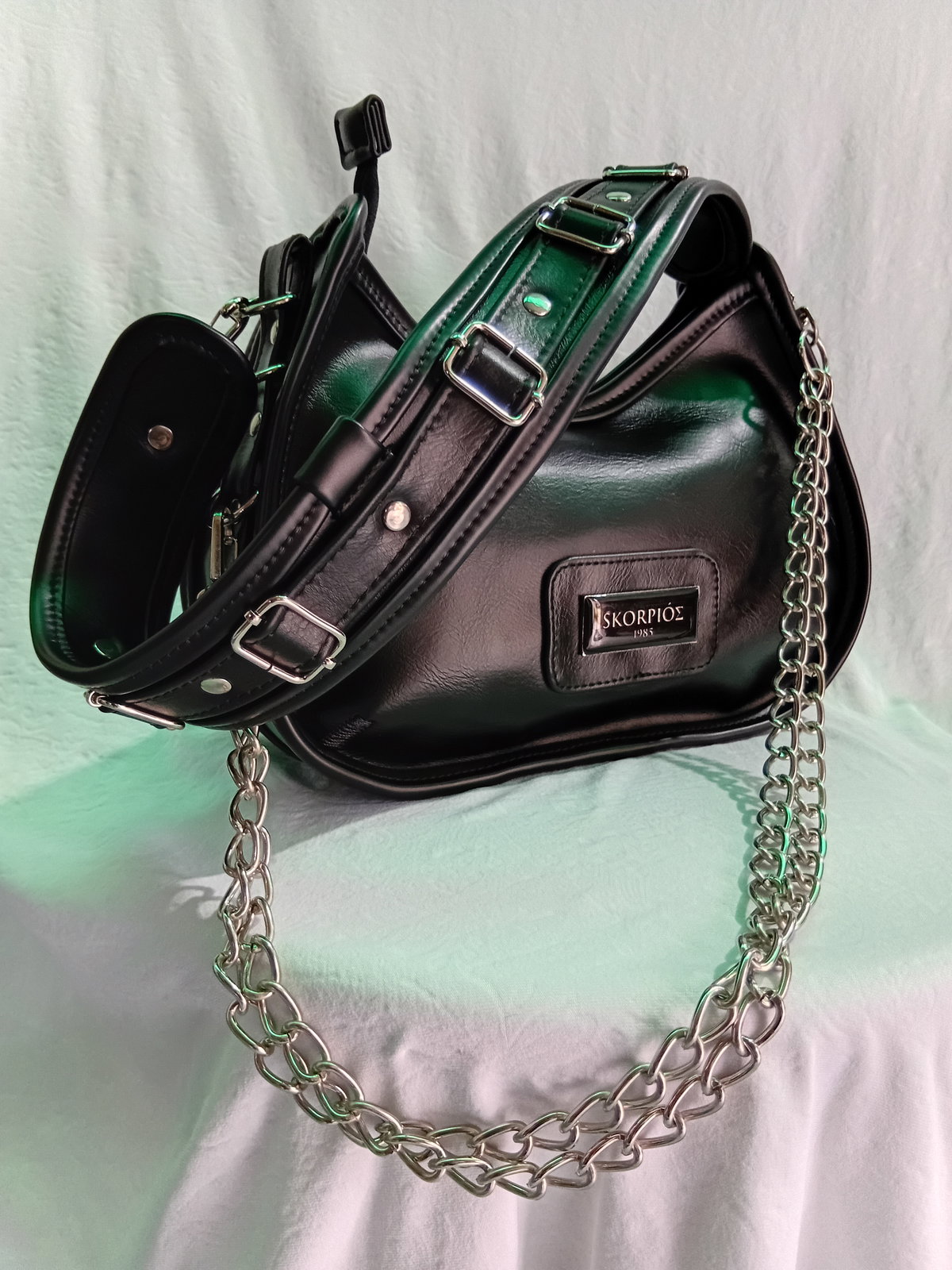 DESTACA POR SU CORREA ANCHA CON HEBILLAS METALICAS Y SU CADENA QUE APORTA CARACTER Y SOFISTICACION. EL LOGO FRONTAL SKORPIOS 1985 BRILLA COMO UN SELLO DE IDENTIDAD UNICA